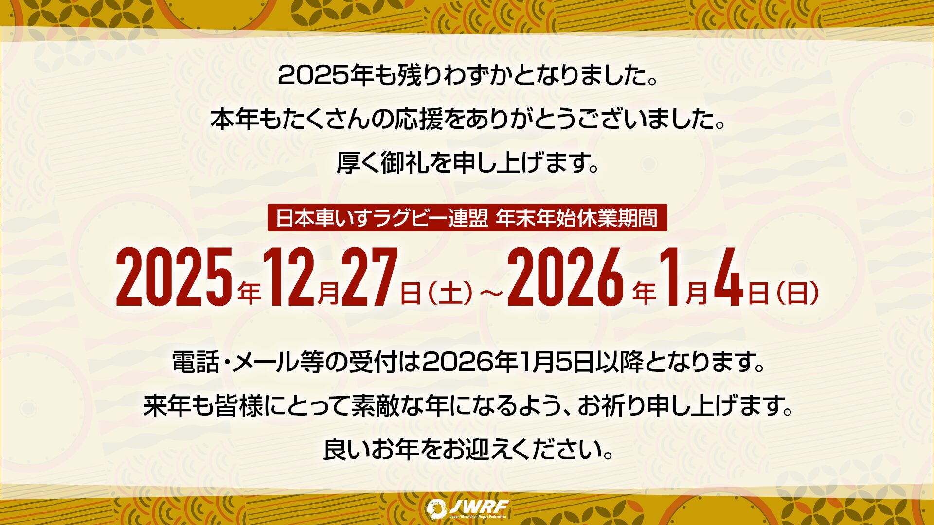 なお、当連盟では下記の期間を年末年始休業とさせていただきます。